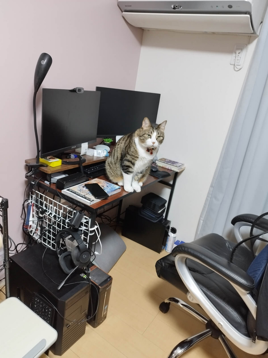 こういうデスクだから、手前にあんまりキーボードとマウス引っ張り出せないんですよ。